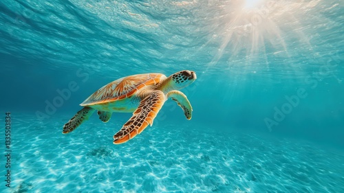 Obraz premium Sea Turtle Underwater in Vibrant Turquoise Water with Sunlight