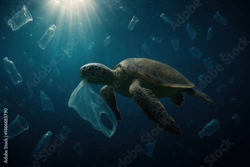 Fototapeta premium Sea turtle underwater surrounded by plastic pollution, highlighting...