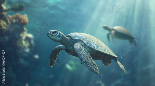 Fototapeta premium Sea Turtles Swimming Near Coral Reef with Tropical Fish