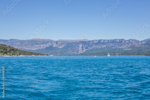 © Angelina Zinovieva, Fototapeta premium sea view and mountains antibes France with ship