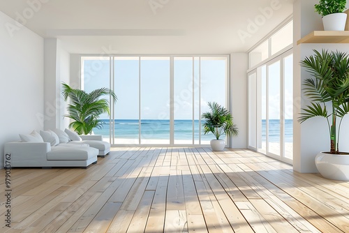 © Sadia Batool, Fototapeta premium Sea view living room with wooden floor and empty white wall background in luxury beach house, Modern interior of vacation home - Office lounge 3D rendering