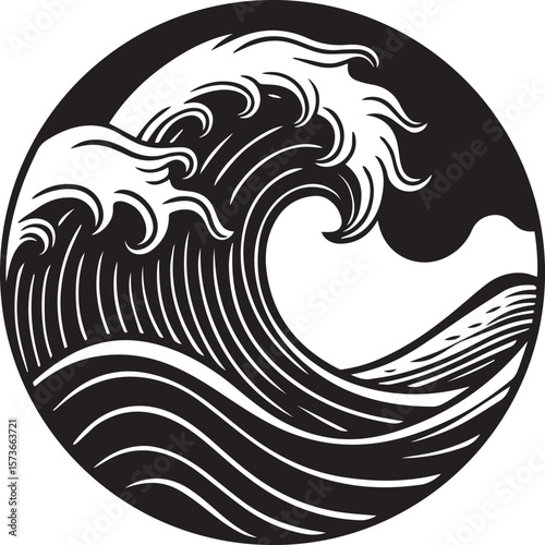 © Silhouette Stock 10., Obraz premium sea wave round silhouette vector illustration, sea wave round icon black and white