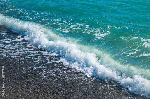 Fototapeta premium Sea wave with foam on a pebble beach.