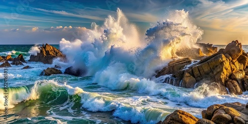 Naklejka premium Sea waves crashing violently against rocks in the afternoon , beach, ocean, nature, power, waves, water, crashing, rocks