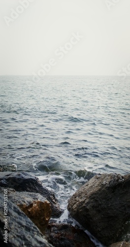 © m-art, Fototapeta premium Sea waves hit large rocks on the coast, foaming and splashing as they wash over the boulders. Vertical video on a sunny day. 4k video, red komodo