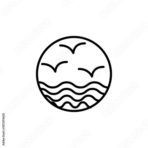 © Topline, Fototapeta premium Sea with seagull icon black and white vector outline sign