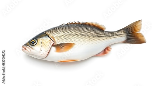 © qinglan, Fototapeta premium seabass. A single, fresh sea bass presented on a clean white background. menu design, packaging mockups, designed for culinary blogs and recipe cards for restaurants, used by clinicians.