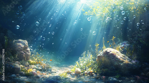 Fototapeta premium Seabed with corals and weeds, stones and bubbles. Deep underwater sea, ocean...