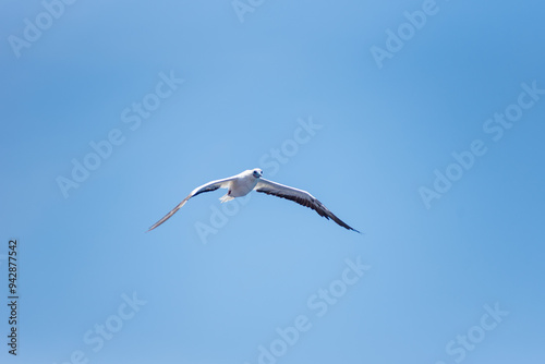 Obraz premium Seabird Masked, Blue-faced Booby (Sula dactylatra) flying over the blue, calm...