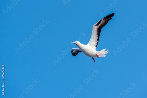 Fototapeta premium Seabird Masked, Blue-faced Booby (Sula dactylatra) flying over the ocean....