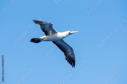 Obraz premium Seabird Masked, (Sula dactylatra) flying over the ocean. Seabird is hunting...