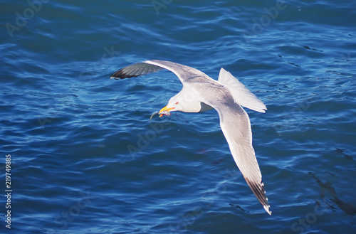© Sergii Mironenko, Obraz premium Seagul flying over the sea near the mountains