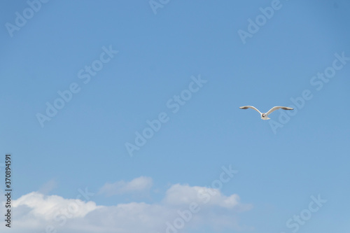 Fototapeta premium seagull flies by the sea on a warm sunny summer day. Sky.