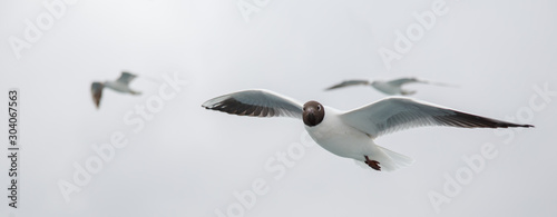 Fototapeta premium Seagull flock on blue sky background. Seagulls flying in sky. Flock of...