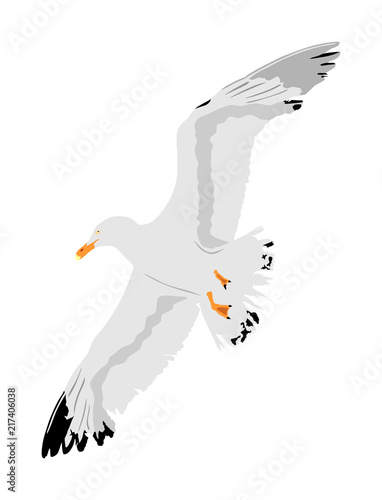 © dovla982, Naklejka premium Seagull fly on sky, isolated on white background vector illustration, sea or ocean bird with spread wings. Bird fly silhouette.