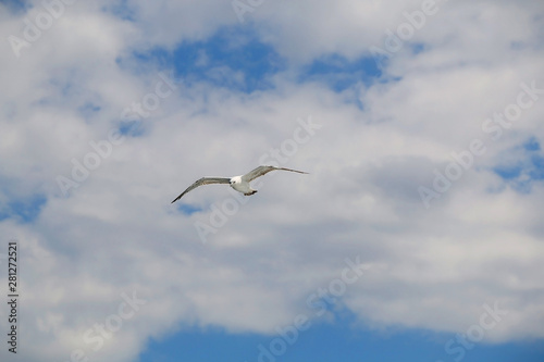 Obraz premium Seagull flying against cloudy sky. Copy space.