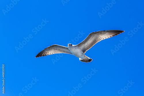 © YiannisMantas, Fototapeta premium Seagull flying high at the clear blue sky