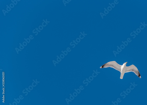Obraz premium Seagull Flying in a Clear Blue Sky