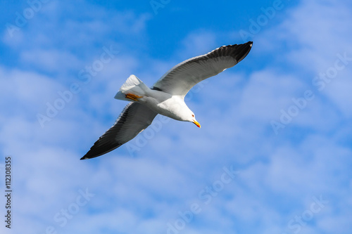 Fototapeta premium Seagull flying in blue sky, closeup photo
