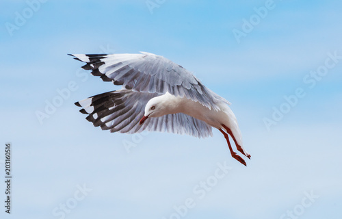 © jodie777, Obraz premium Seagull flying in the blue sky.