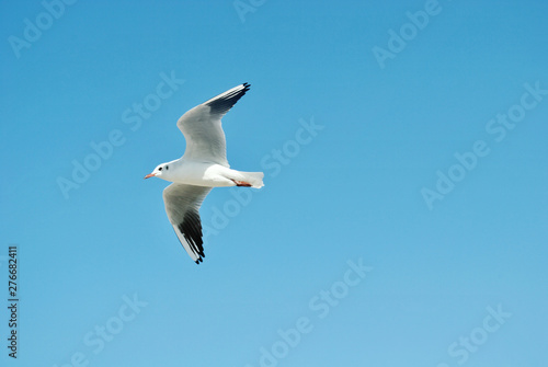 © sparrowbh, Obraz premium Seagull flying on beautiful blue sky