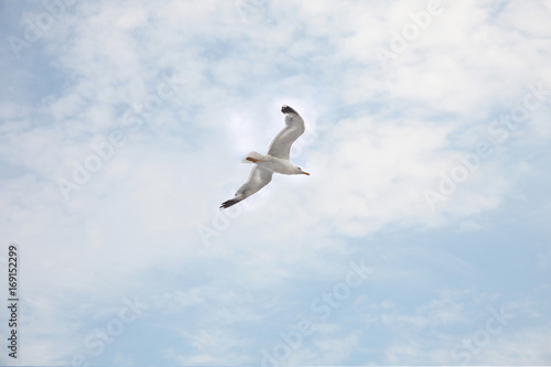 © zinovskaya, Obraz premium Seagull flying on sky background with clouds