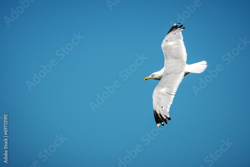 © pio3, Obraz premium Seagull flying over blue sky isolated.