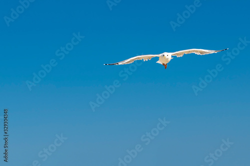 Obraz premium Seagull, flying over blue sky with clouds