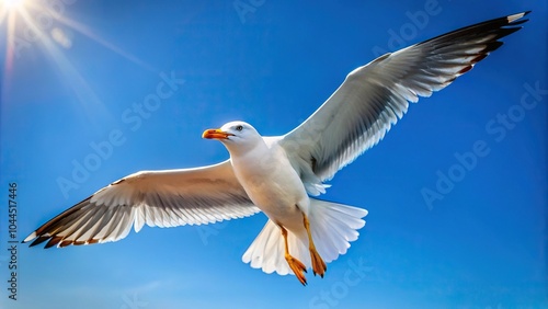 Obraz premium Seagull flying with open wings on clear sky during summer