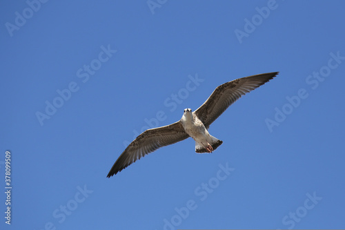 © leomalsam, Obraz premium Seagull in low level flight against the blue sky