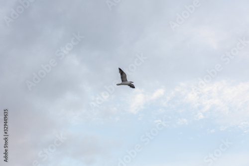 © Tatiana, Obraz premium Seagull in the sky in cloudy weather against a cloudy sky