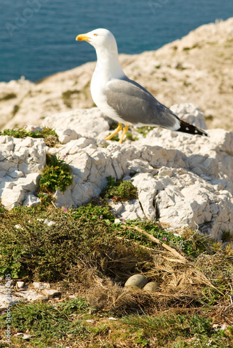 © Ekaterina Pokrovsky, Fototapeta premium Seagull near its nest with three eggs. Focus on eggs