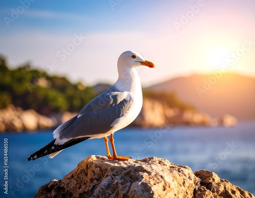 © mergo, Obraz premium Seagull on a rock at sunset