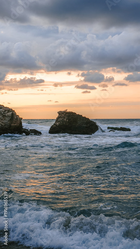 © berryland, Fototapeta premium Seagull on rock in sea waves at sunset