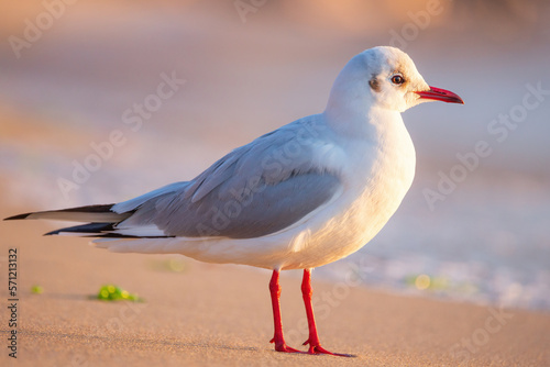 © ValentinValkov, Fototapeta premium Seagull on the beach sand against the sea
