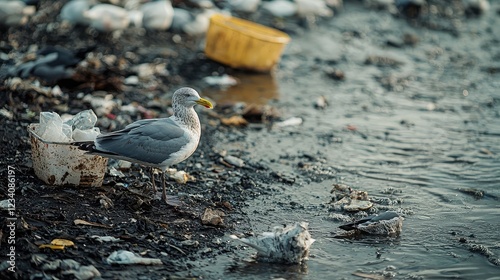 © wiraphat, Obraz premium Seagull on the Shoreline Amongst Debris and Garbage in a Natural Habitat Wide Angle Perspective