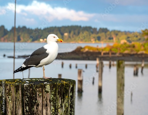 © Drona, Obraz premium Seagull perched on a weathered pier post overlooking a tranquil harbor