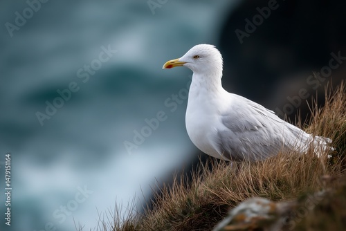 © Nature_Beauty, Obraz premium Seagull Sitting on Grass with Ocean in Background