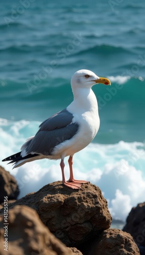 Fototapeta premium Seagull sitting on rocky wave, nature, coastline