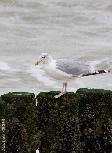 © simonmuß, Fototapeta premium Seagull sitting on wave breakers/poles with waves in the background