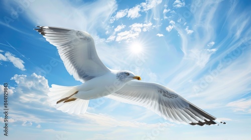 Fototapeta premium Seagull soaring against blue sky with empty space