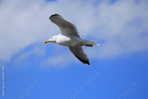 Obraz premium Seagull soaring gracefully in blue sky with scattered clouds, close-up bird in flight, nature and wildlife photography for travel, freedom, and inspiration themes