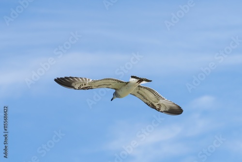 Obraz premium Seagull soaring in a blue sky.