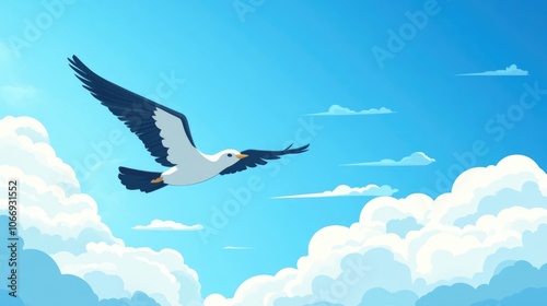 Obraz premium Seagull soaring in clear blue sky above fluffy clouds, serene scene on blue...
