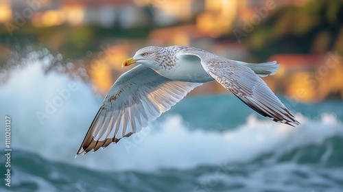 Fototapeta premium Seagull soaring over ocean waves with a blurred coastal background and soft golden light creating a serene coastal atmosphere