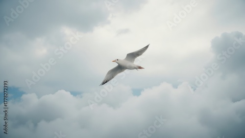 © Nia, Obraz premium Seagull soars gracefully against a backdrop of fluffy white clouds