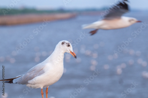 © apichon_tee, Obraz premium Seagull standing on a bridge, background, flocks of seagulls flying.