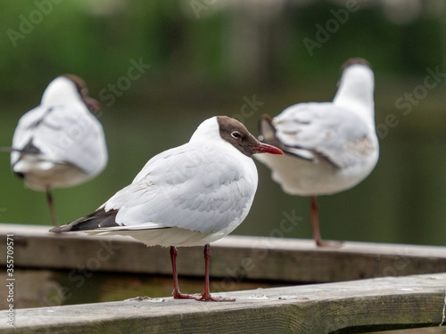 © Teemu, Fototapeta premium Seagull standing on a handrail by lake
