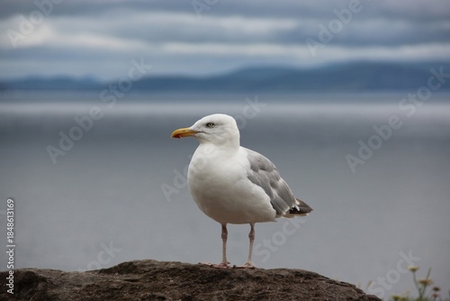 © Morphart, Obraz premium Seagull Standing on a Rock Near the Coast on a Cloudy Day