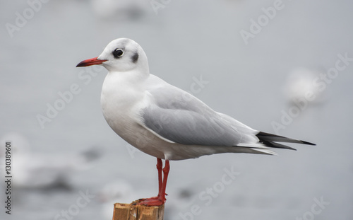 Fototapeta premium Seagull standing on a stump in marina.